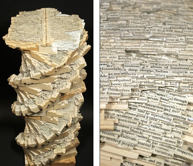 Brian Dettmer carves dozens of delicate sculptures by slicing through volumes of books that have been dumped in charity shops or antique bookstores. Each sculpture becomes a 3D collage which transforms the viewer's perception of the book. But Dettmer does something different: unlike a collage, nothing is stuck on to the page. Instead he carves around the images and words slotting in between the covers giving the old books a new chance of life.